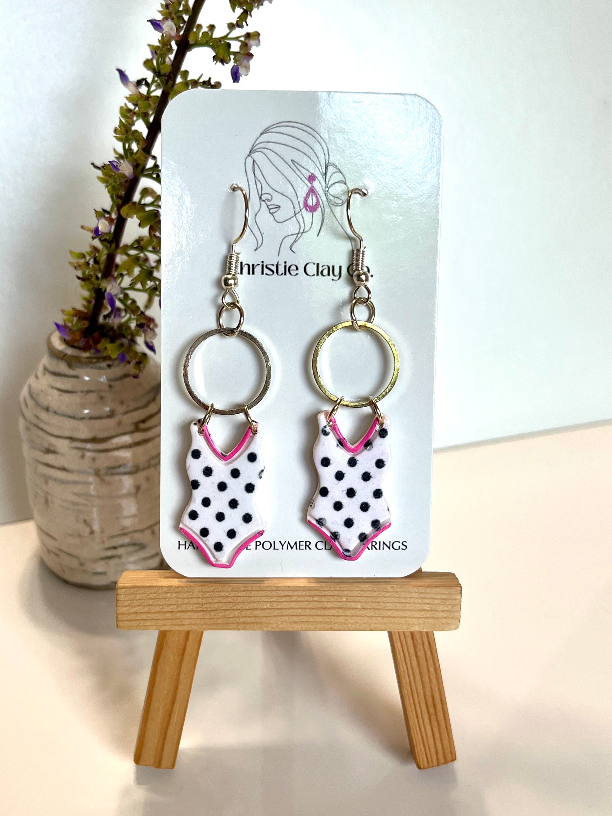Silver hardware with silver circle dangles and polka dot design bathing suits