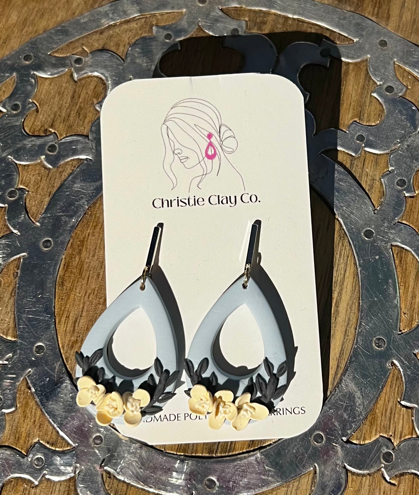 Bridgerton Inspired. Many blue cutout rounded triangle with ivory flower and silver accents. Hanging from faux pearl.