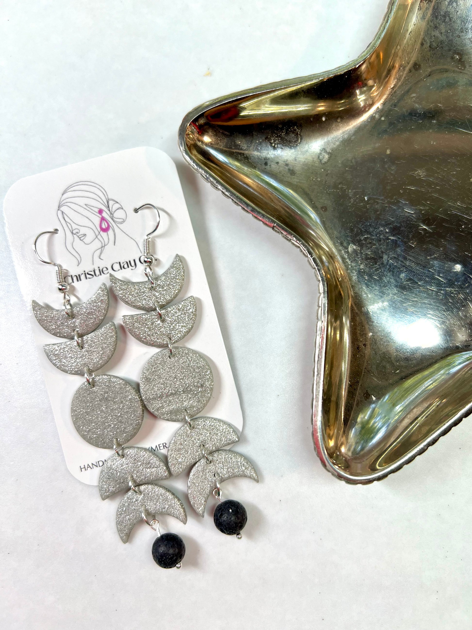 Sparkle moon phase earrings with lava rock