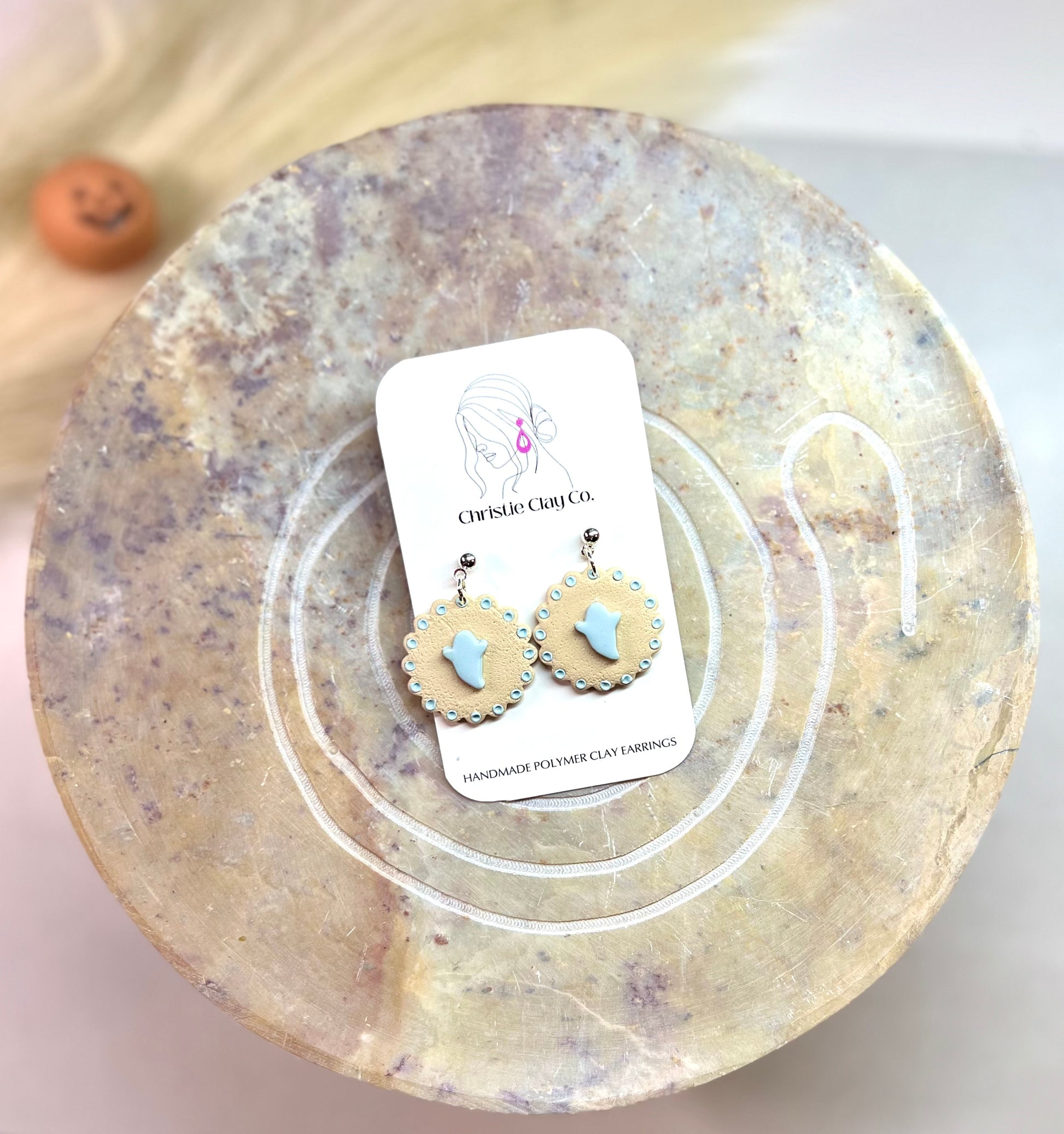 Nuetral pastry with blue ghost. Silver hardware.