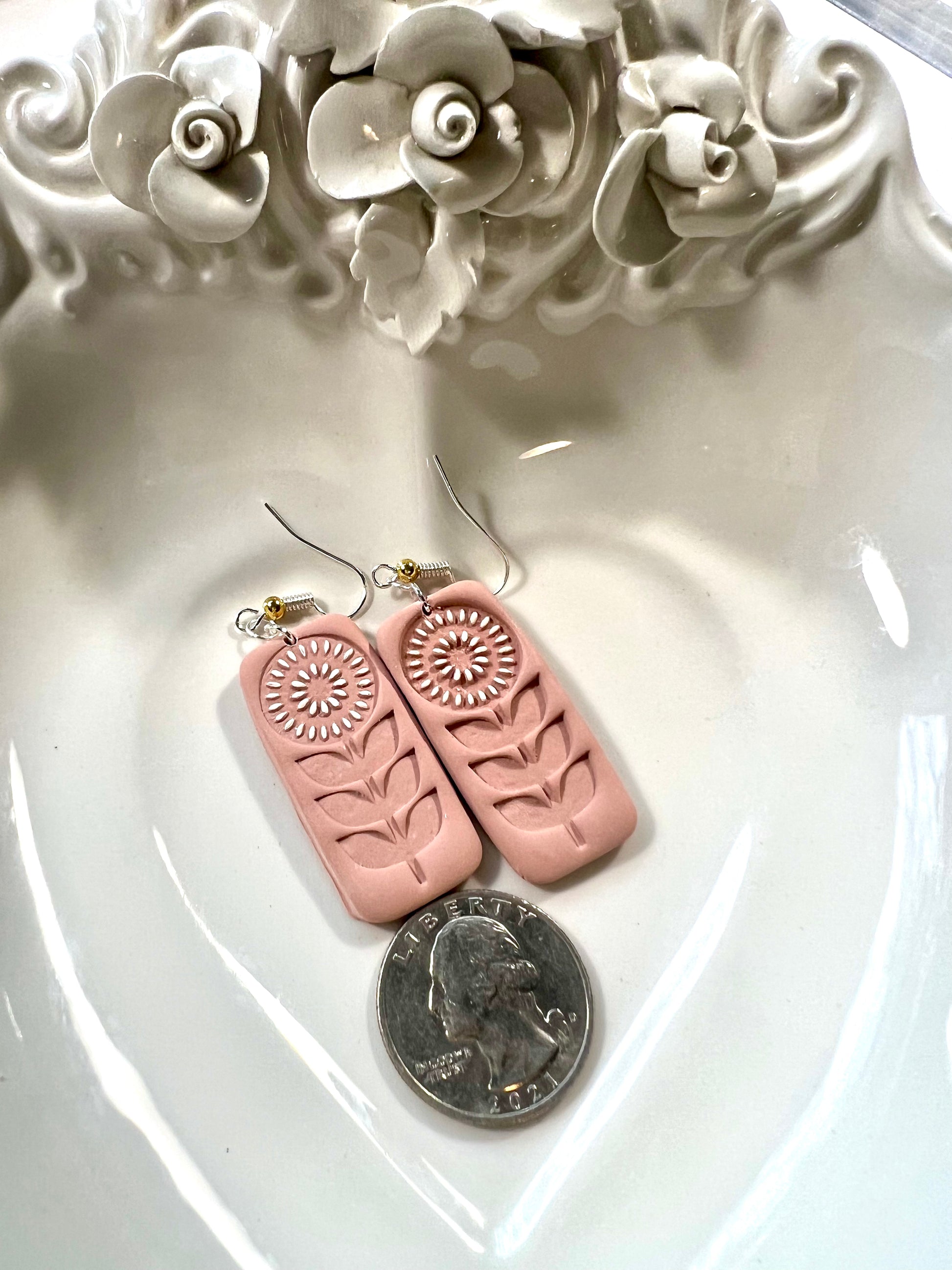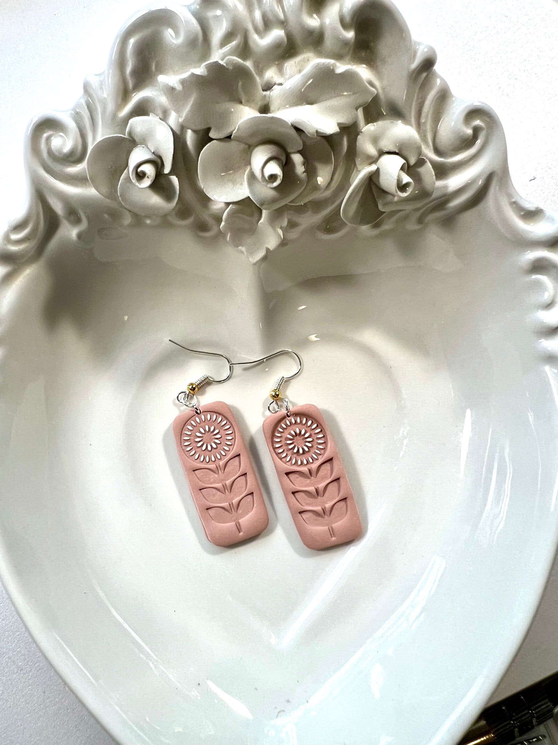 Lightweight polymer clay dangle earrings. Flower dangle with hand-painted details. From our Spring Collection.