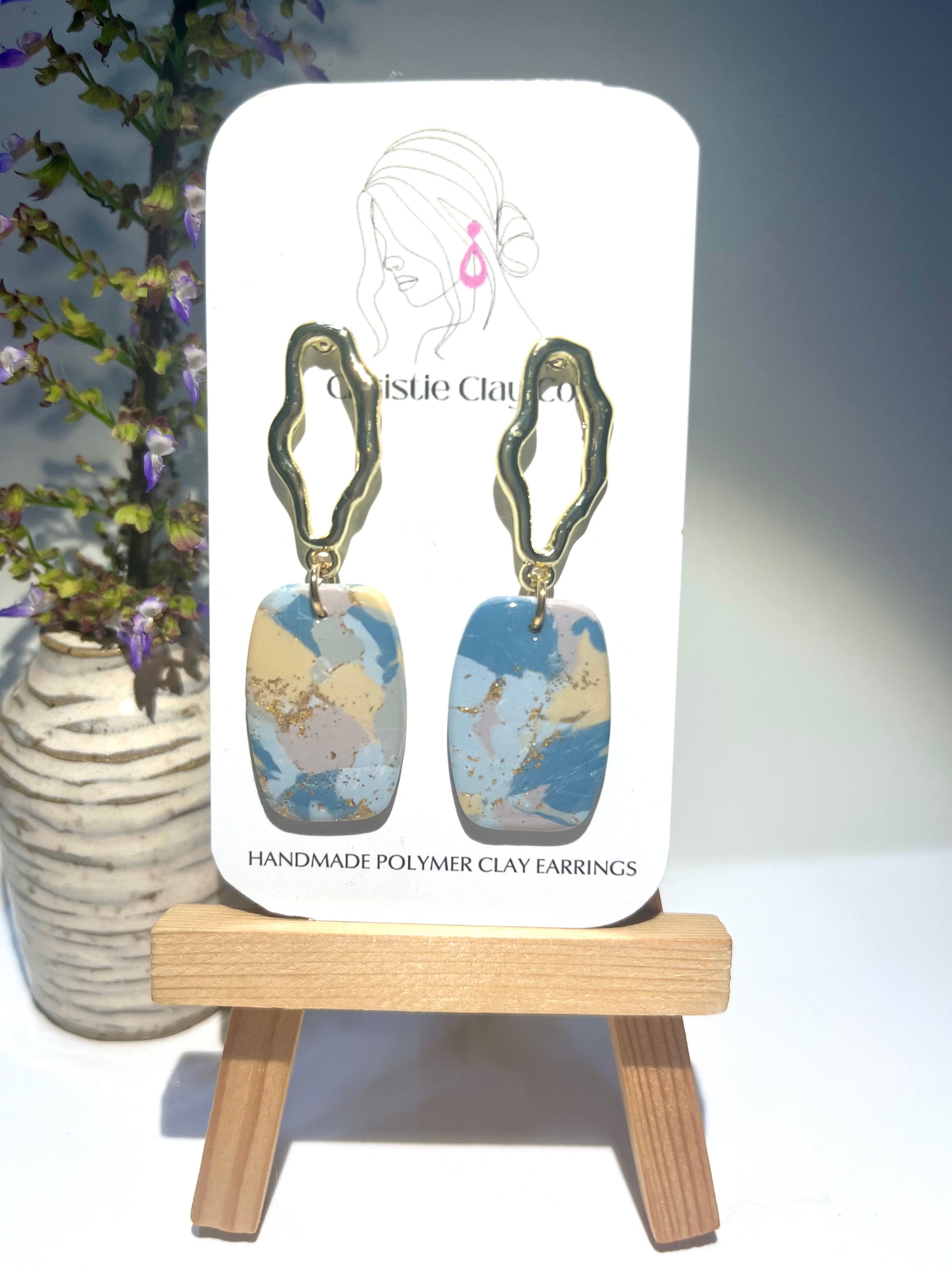 Gold hardware with gold finding dangle and gray/blue marble design