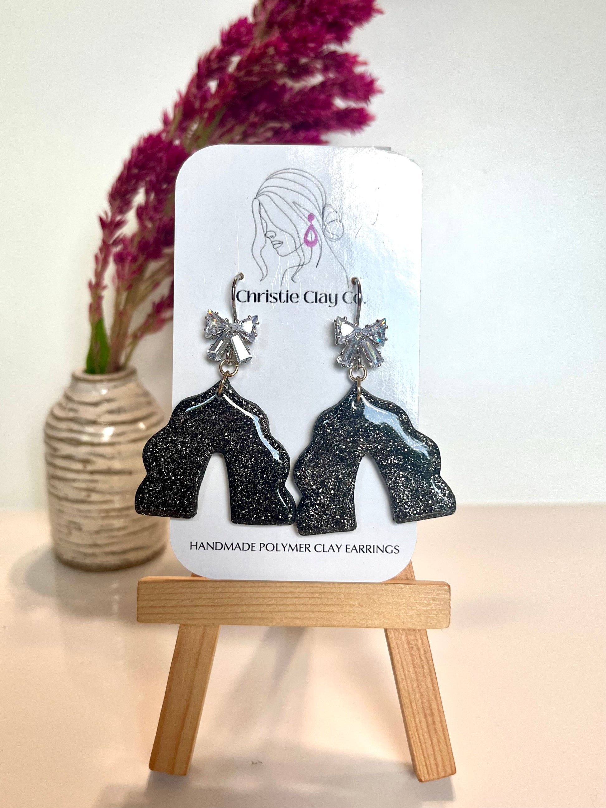 Silver hardware with silver bows and black with glitter
