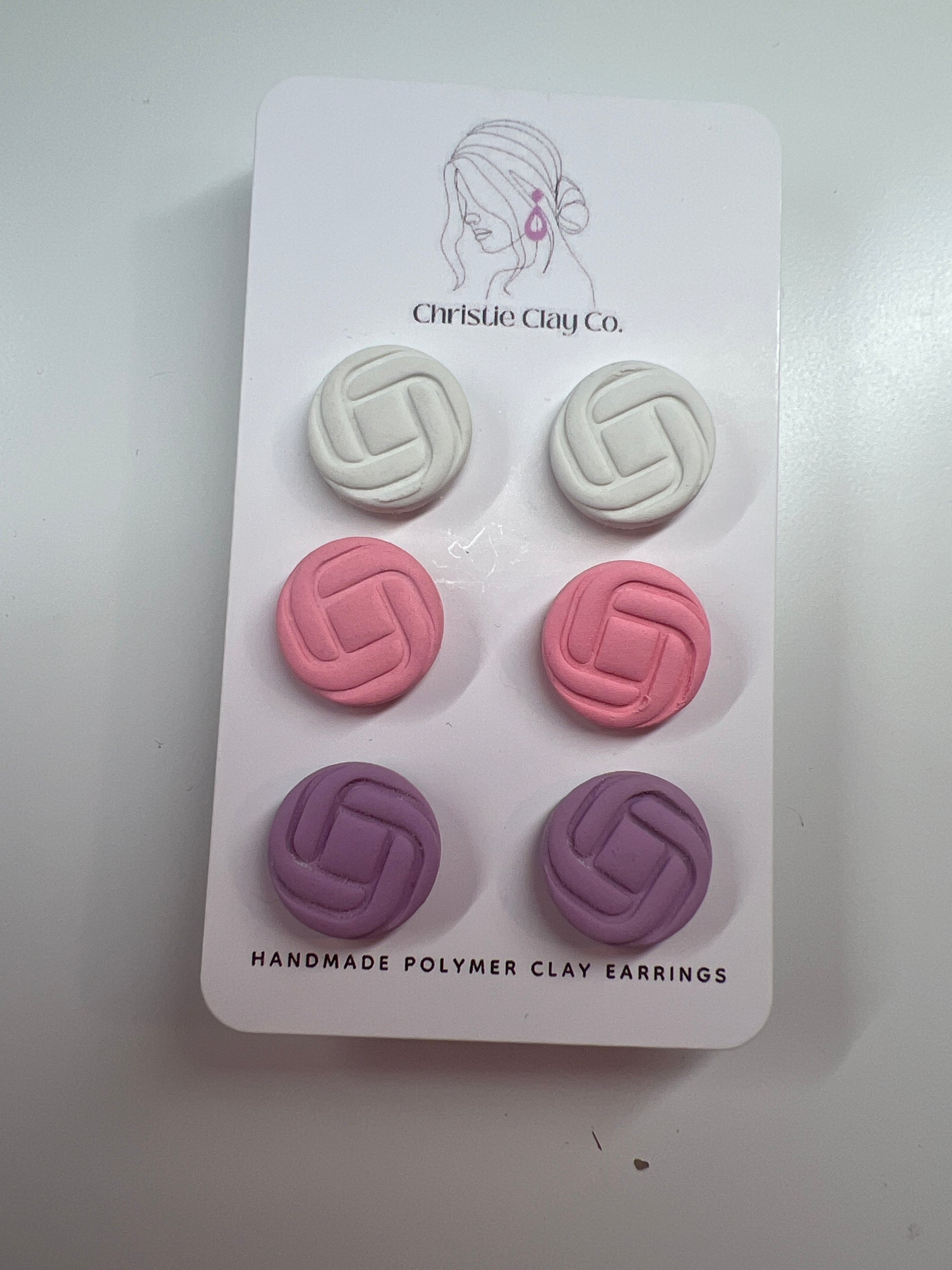 Three-pack of handmade, lightweight polymer clay stud earrings. Pink, lavender, cream. From our Spring Collection.