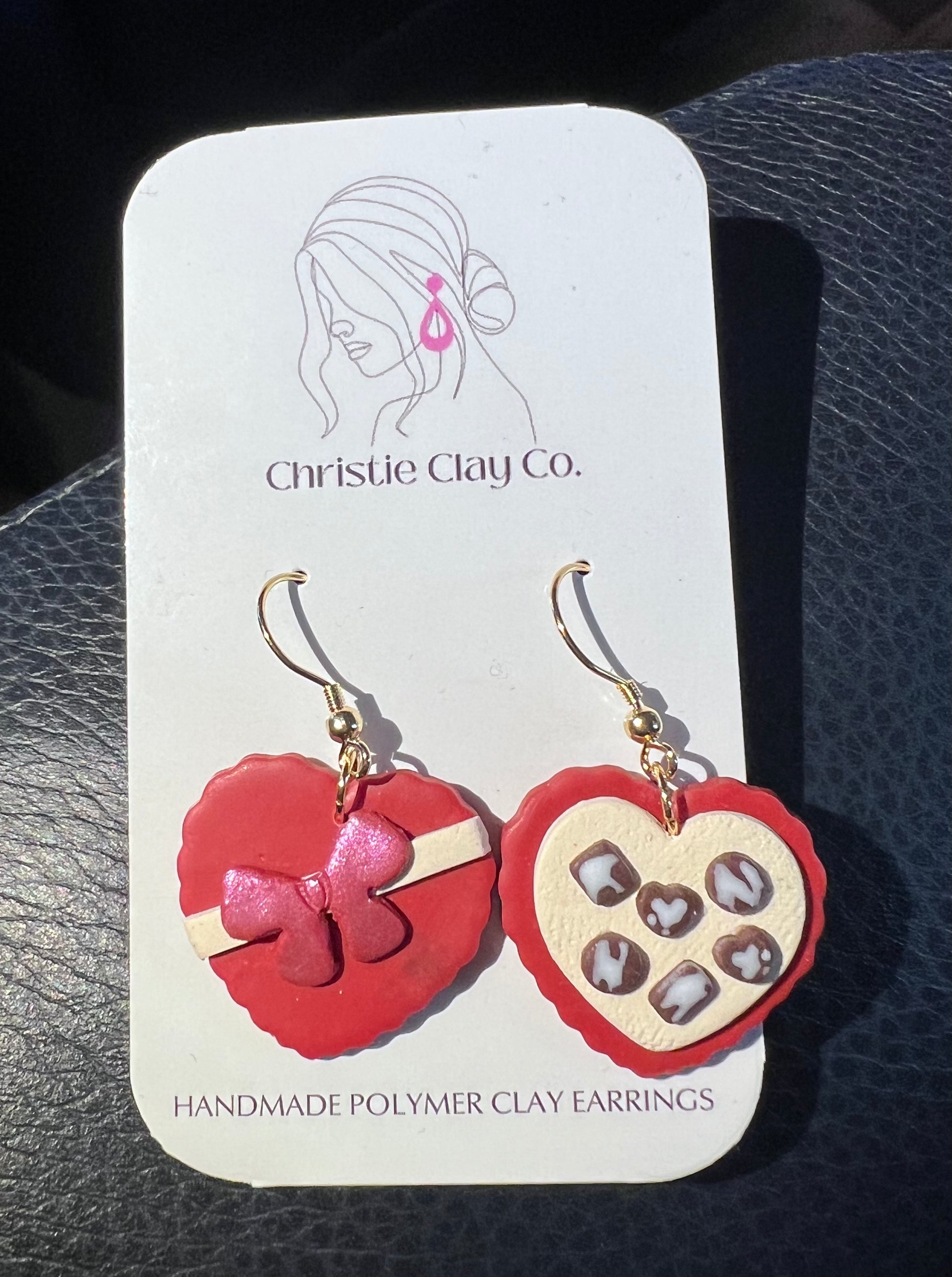 Valentines. Heart boxes with decorated chocolates. Gold dangle hardware.