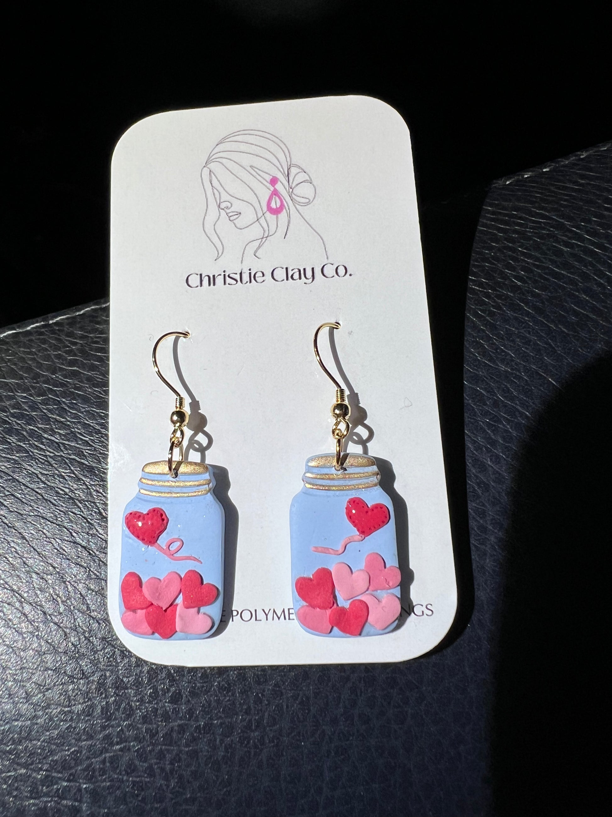 Valentines. Blue jar filled with multi colored hearts. Gold hardware.