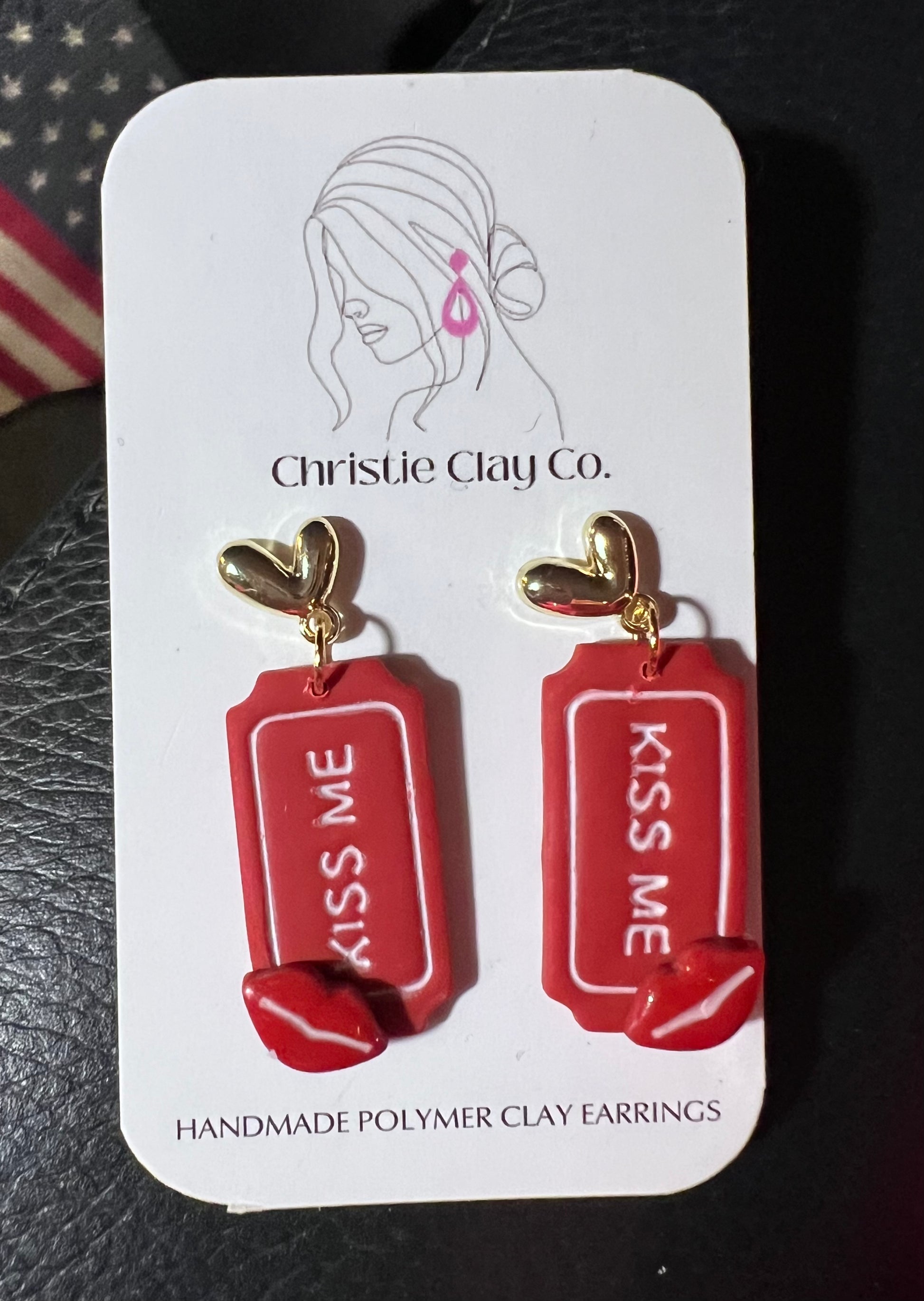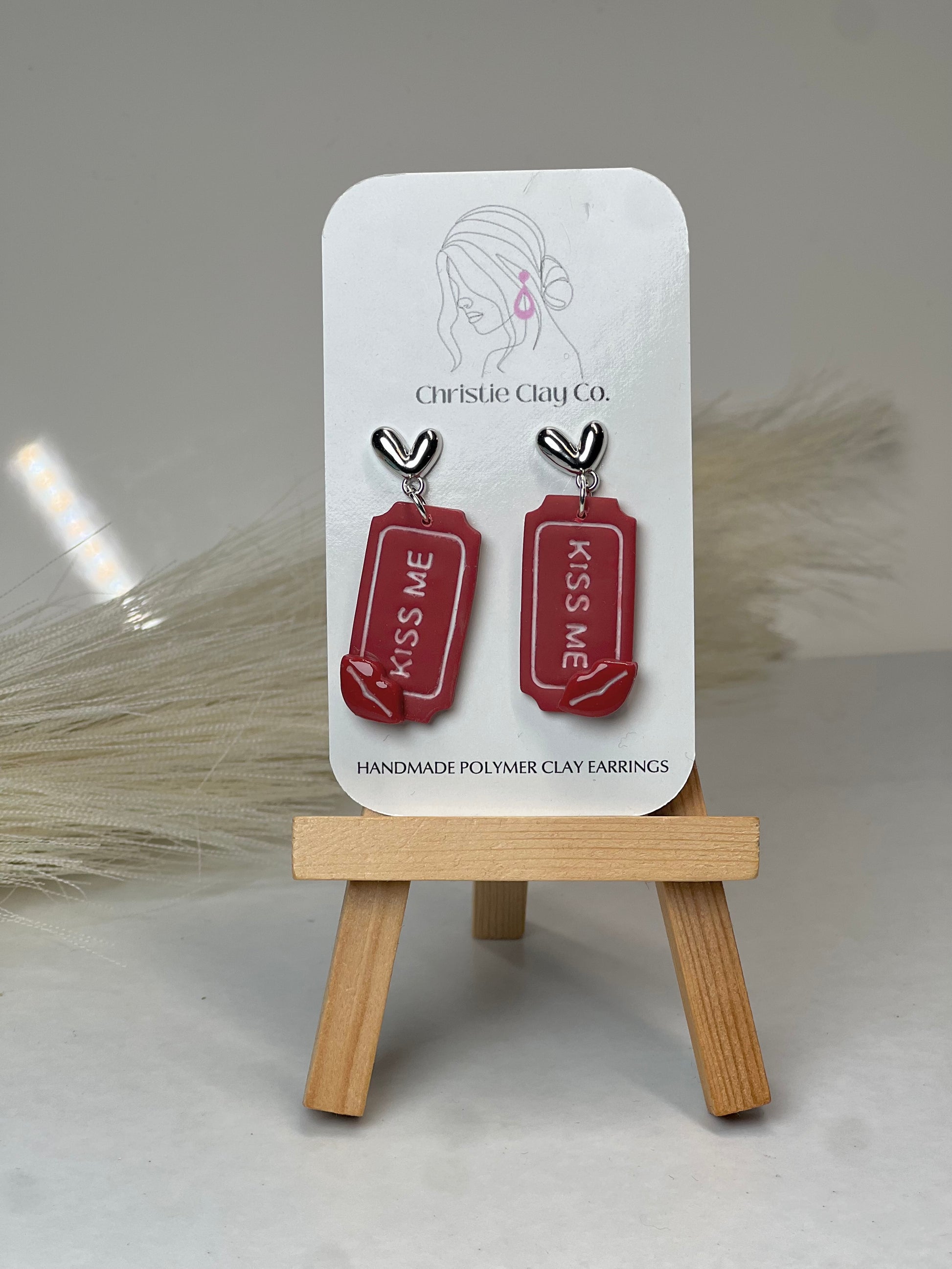 Valentines. Kiss Me tickets with shiny lip accents. Available in either silver or gold heart hardware.